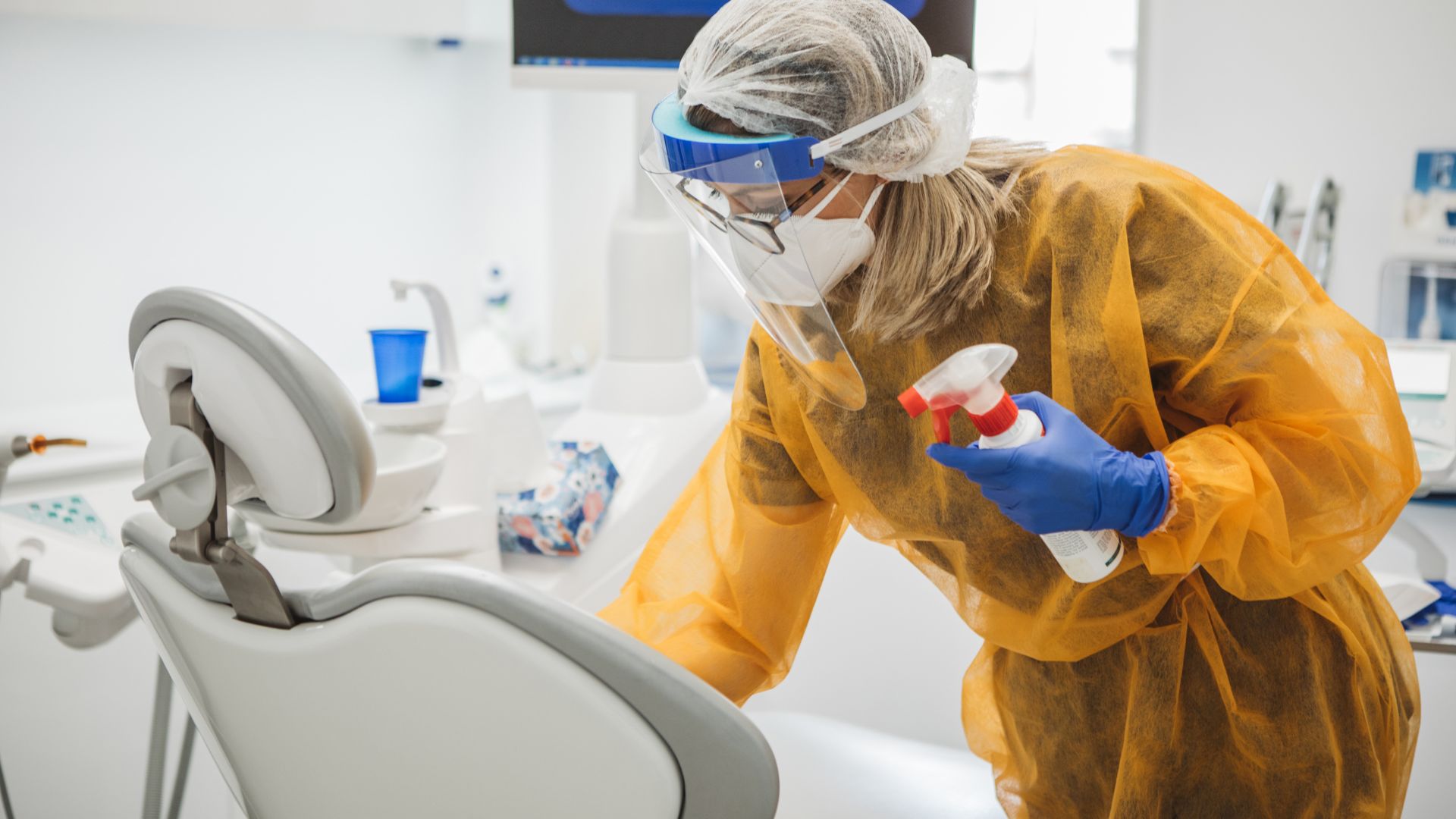 La procedura di disinfezione che riguarda il paziente prevede sciaqui con colluttorio alla clorexidina allo 0,12% o 0,3%, da effettuare appena prima dell’atto terapeutico e per un minuto circa per diminuire la carica batterica intraorale. Il paziente deve entrare nell’ambiente operativo con copriscarpe e deve essere protetto dal personale addetto con teli monouso.